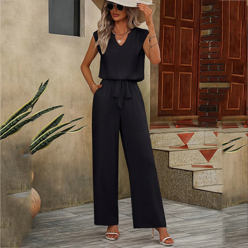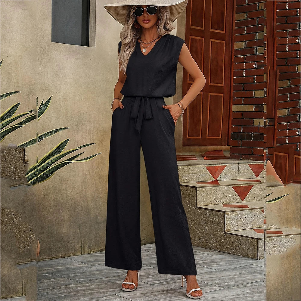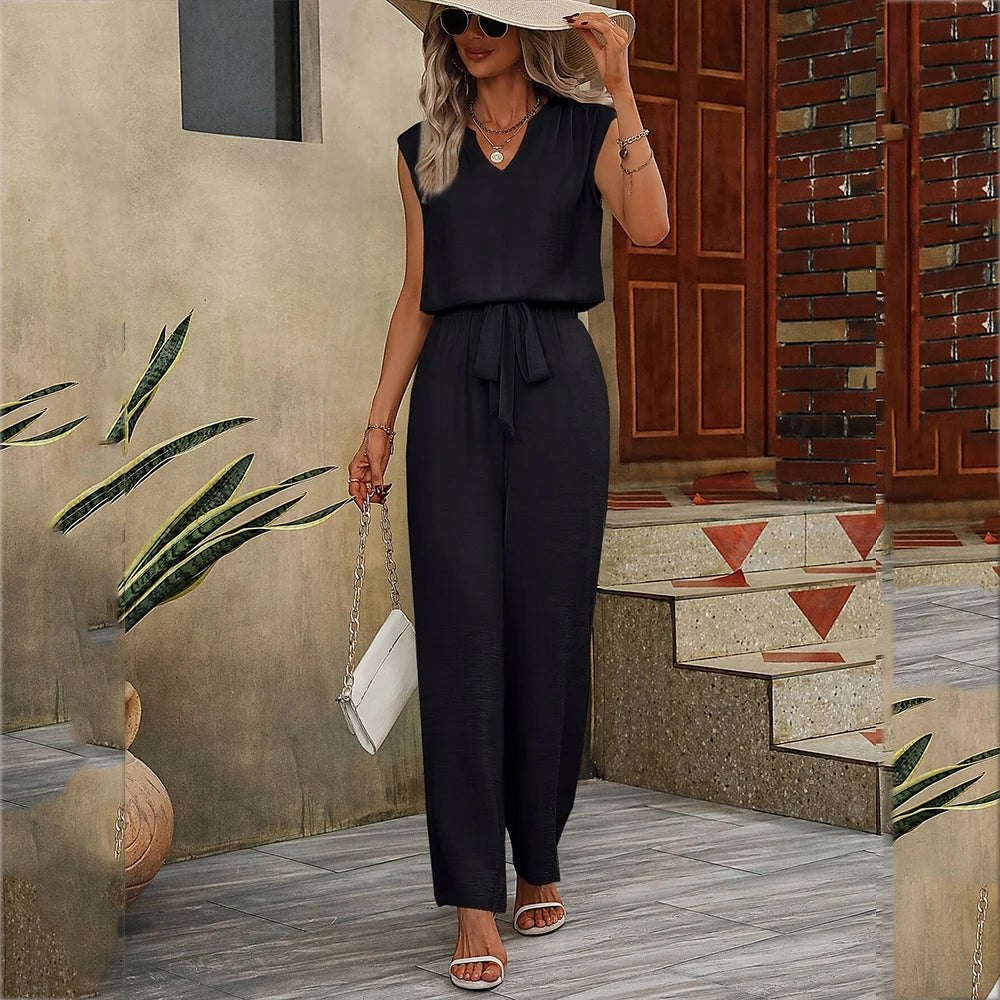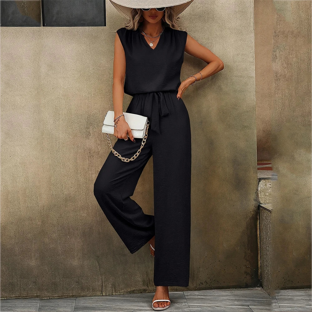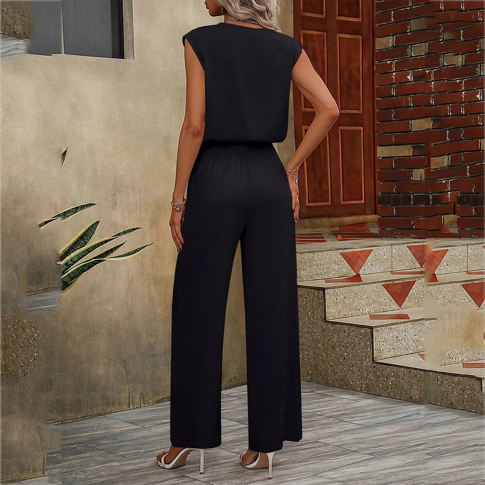 Ontdek de perfecte combinatie van comfort en elegantie met onze nieuwe zwarte tweedelige jumpsuit 'Mérida'. Deze set creëert direct een complete en modieuze outfit en bestaat uit een mouwloze top met V-hals en een broek met hoge taille en wijde pijpen, inclusief handige zakken.