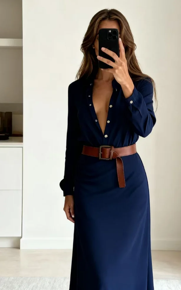 Elegante pasvorm: flatterende V-hals, gedefinieerde taille met ceintuur, vloeiende lengte.
